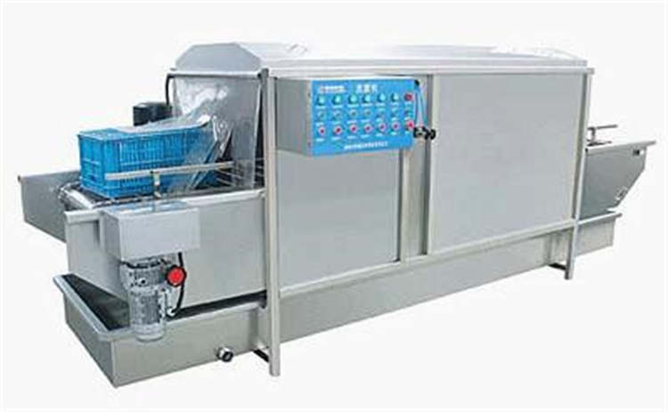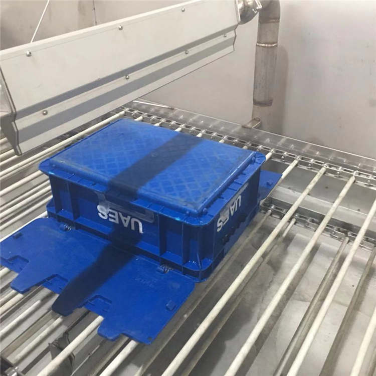 要清洗的周转筐通过不锈钢链条送入洗衣机,然后展开多个步骤,例如热水脱脂→高压热水清洁和消毒→室温自来水冲洗→高压气刀脱水等。,清洗篮筐,并同时完成杀菌和风干;清洗专用筐时,可在热碱水清洗段后加刷子以擦洗筐的底部和左右两侧,以提高清洁效用;连续清洗用以提高清洗效率;